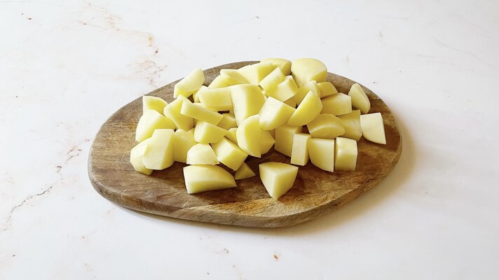 Raccogli la dadolata di patate nel boccale di un mixer insieme alla cipolla 2, tritata grossolanamente al coltello.