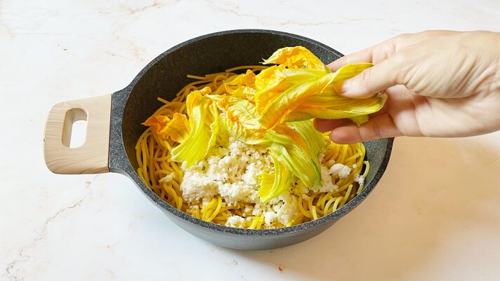 Preparare la pasta ai fiori di zucca e zafferano è davvero semplice e veloce: l'unica accortezza è quella di pulire i fiori di zucca per bene, in modo da eliminare il pistillo centrale, i gambi e i filamenti. Una volta lessata la pasta al dente, ti basterà versarla in un tegame, aggiungere lo zafferano, sciolto in un goccino di acqua, i formaggi, ammorbiditi con un po' di latte tiepido, e infine i fiori di zucca: il risultato è una pietanza avvolgente e irresistibile, perfetta per qualunque pranzo di famiglia o cena con gli amici.