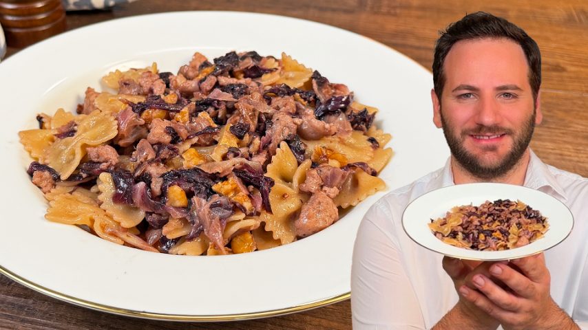 La pasta al radicchio è un primo semplice e gustoso, in cui le farfalle, scolate al dente, vengono mantecate con un fragrante condimento a base di radicchio, salsiccia sbriciolata, scalogno e gherigli di noce, per un piacevolissimo tocco croccante.