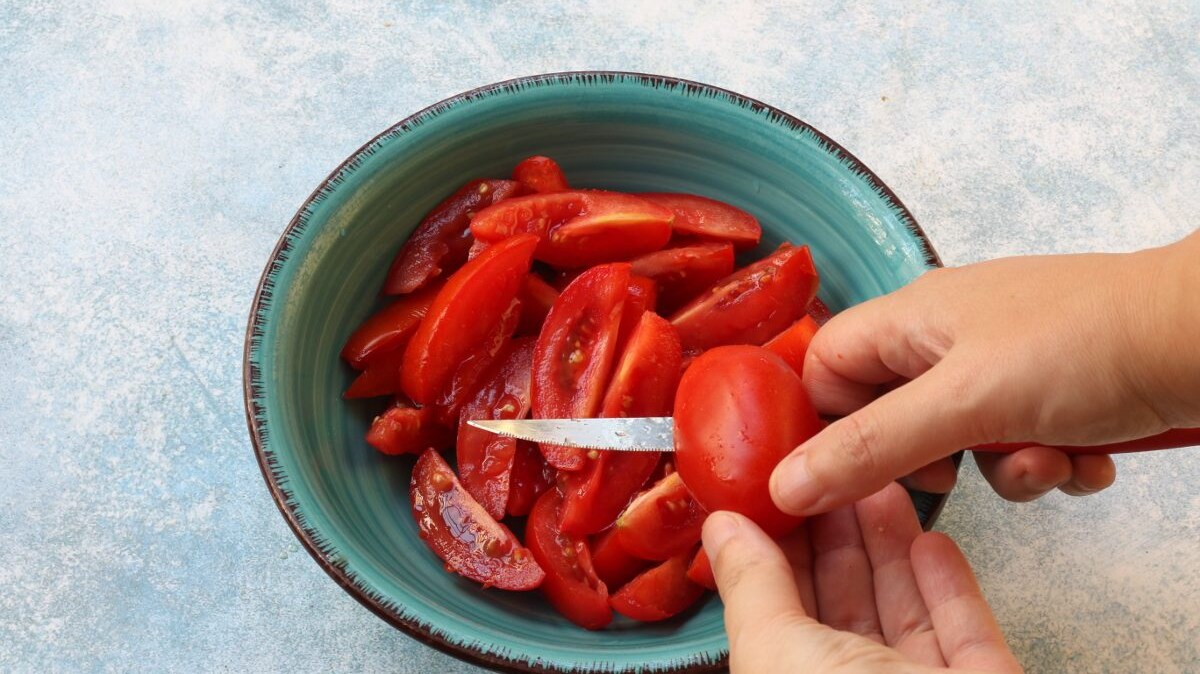 Lavate e asciugate i pomodori, quindi tagliateli a spicchi e raccoglieteli in un piatto 1.