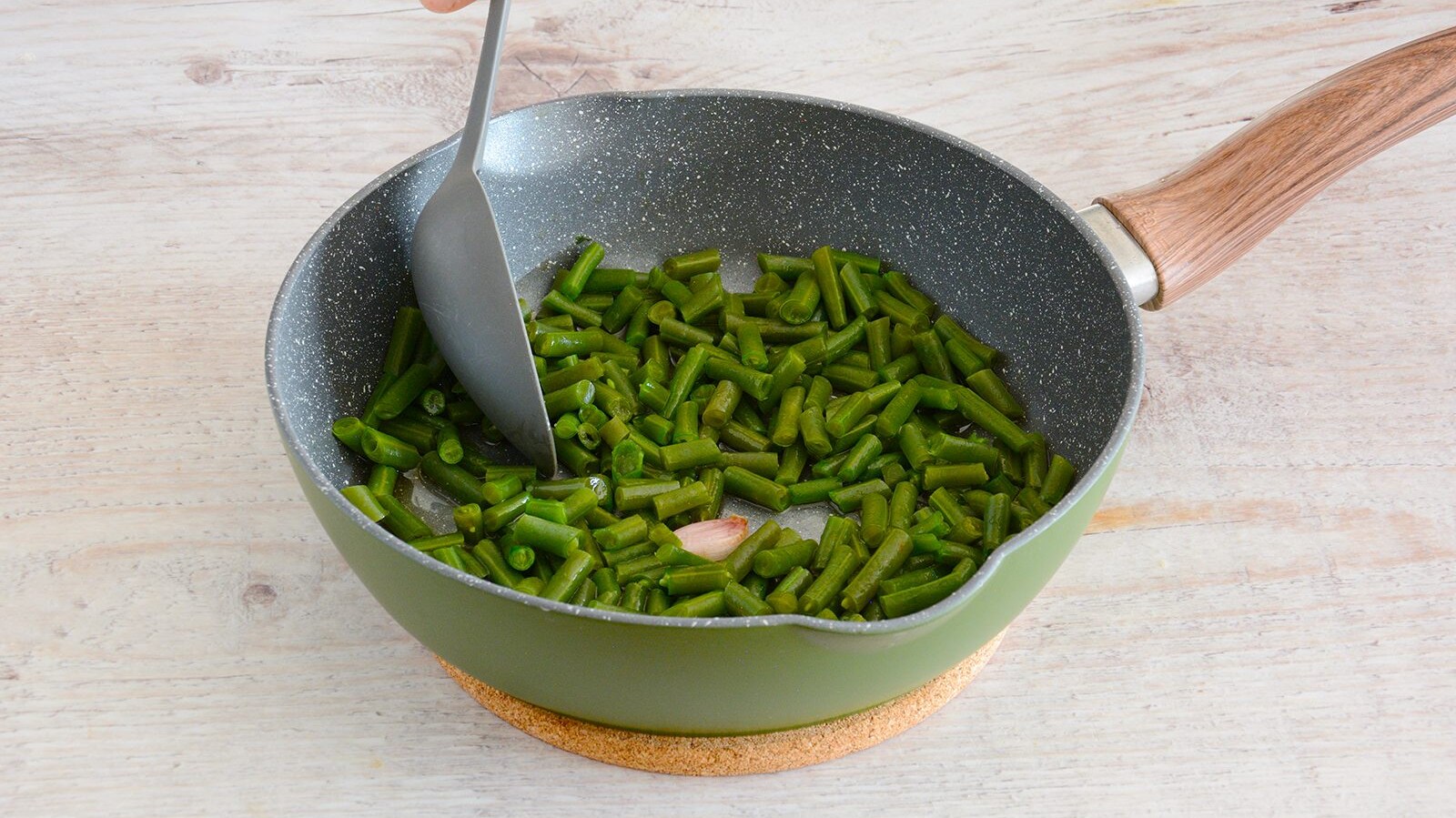 Lascia imbiondire uno spicchio d'aglio con un filo d'olio in una padella capiente, quindi aggiungi i fagiolini 5.