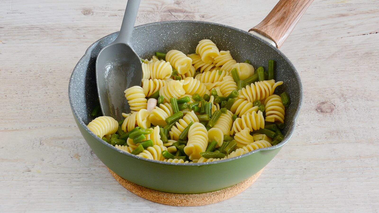 Lessa la pasta nell'acqua di cottura dei fagiolini, scolala molto al dente e trasferiscila direttamente nella padella con gli ortaggi 7.