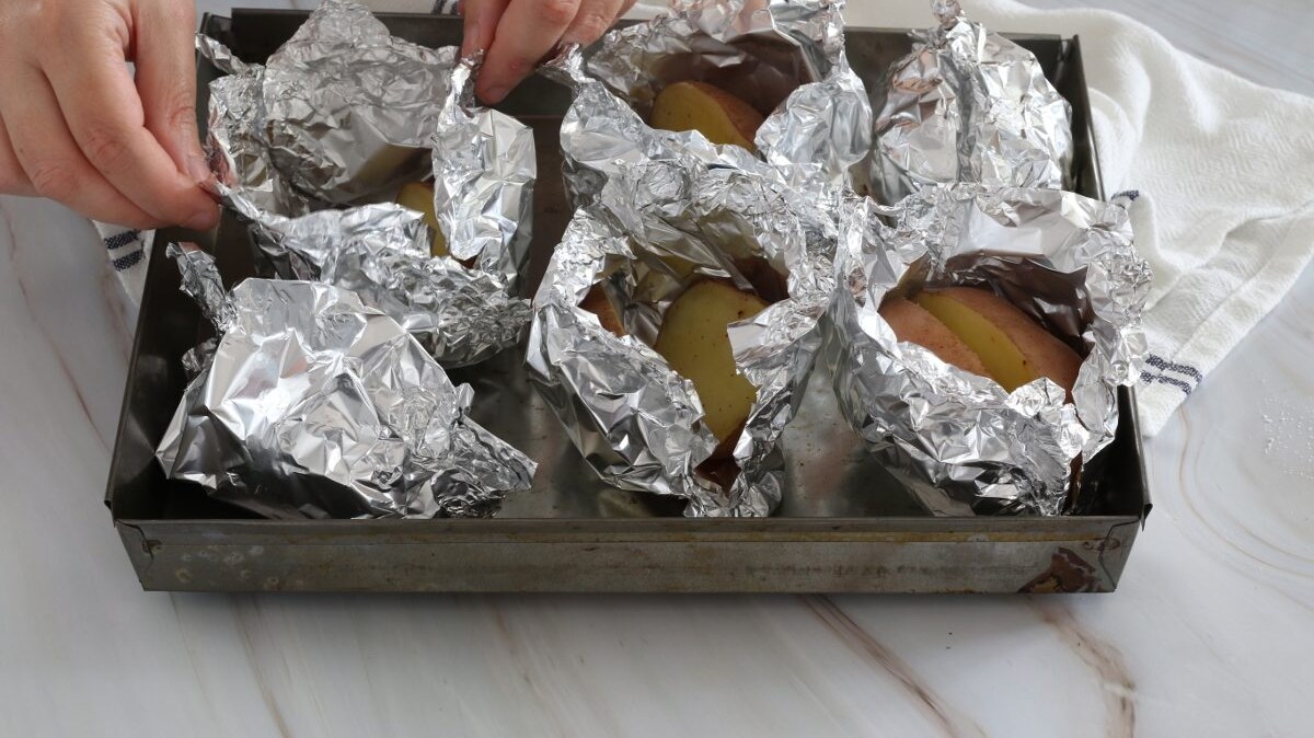 Sistema ogni patata al centro di un quadrato di alluminio 2 e avvolgile completamente, così da ottenere un cartoccio.