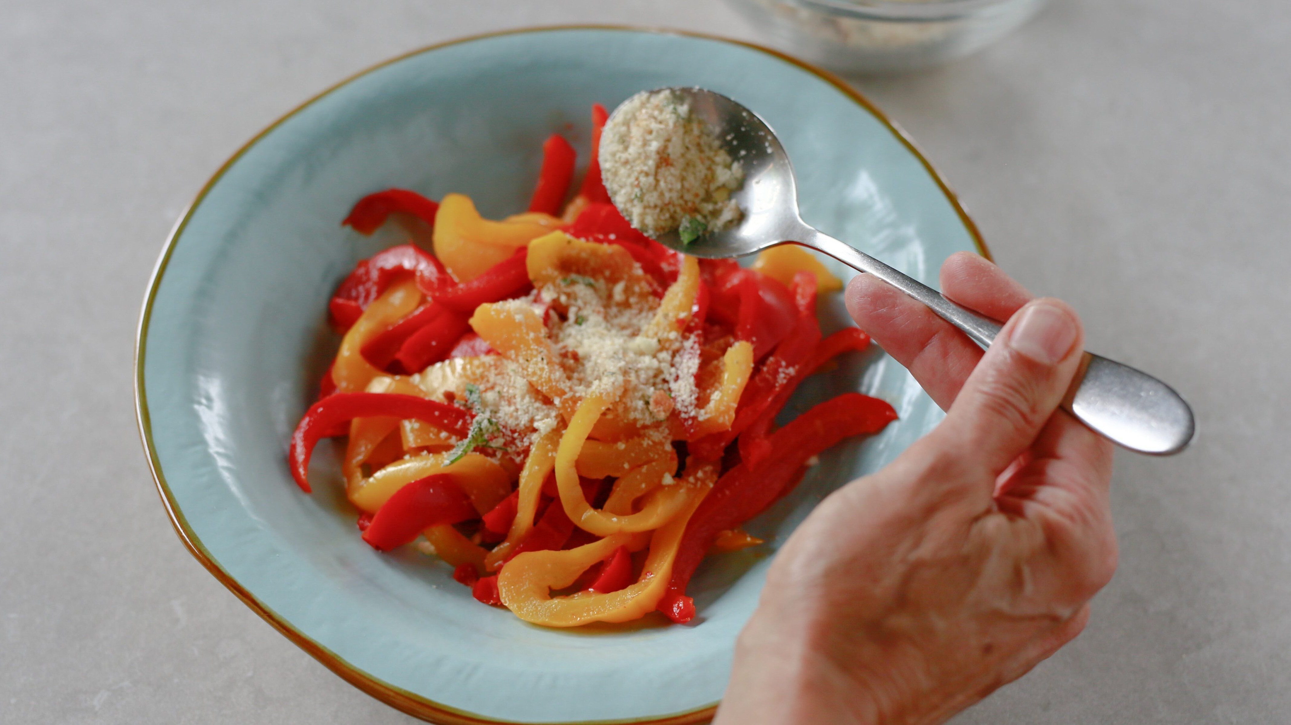 Trasferite in un piatto i peperoni e cospargeteli con la miscela di pangrattato, pecorino, aglio e prezzemolo 7. A piacere, profumate con una macinata di pepe.