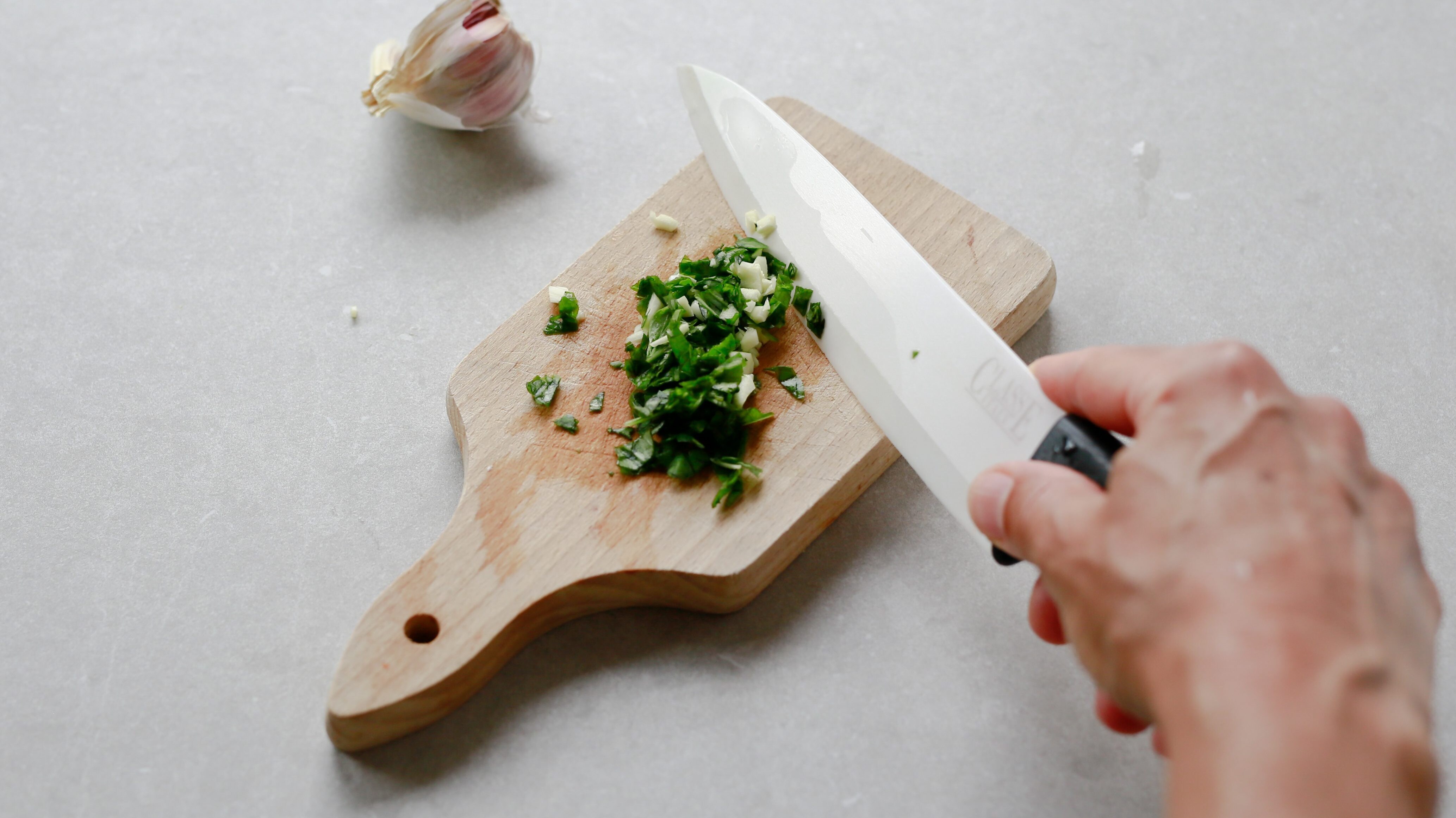 Mentre i peperoni cuociono, tritate il prezzemolo con lo spicchio d'aglio restante 4.