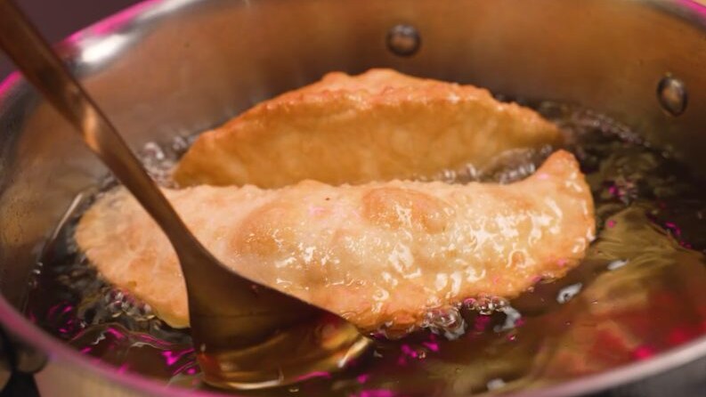 L'impasto originale si realizza senza lievito, con una sfoglia allo strutto; nella nostra ricetta, Giusina ha preparato l'impasto con farina, acqua, poco lievito di birra e strutto e aggiunto anche dei pomodorini al ripieno classico. Una volta preparato l'impasto, dovrà riposare per una ventina di minuti, prima di ricavare delle palline che dovranno lievitare in frigorifero per circa 12 ore. Bisognerà poi stendere le palline, farcirle e richiuderle, sigillandole bene con i rebbi di una forchetta: otterrai così delle mezzelune, pronte da friggere in olio ben caldo fino a doratura.