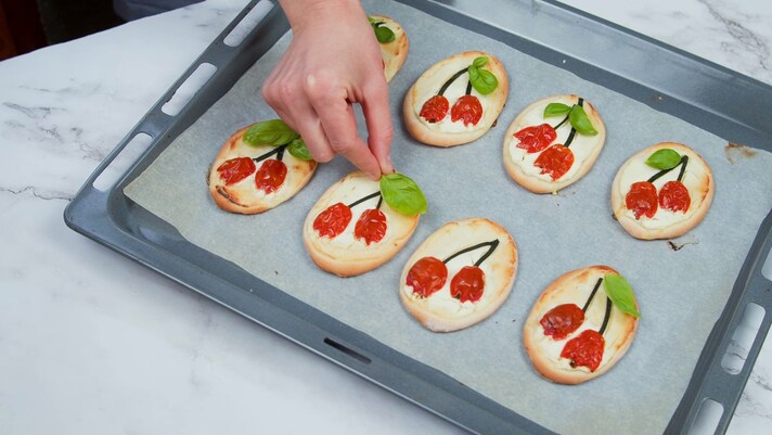 Cuoci in forno statico a 190 °C per 15 minuti. Decora i fiori con le foglie di basilico 8.