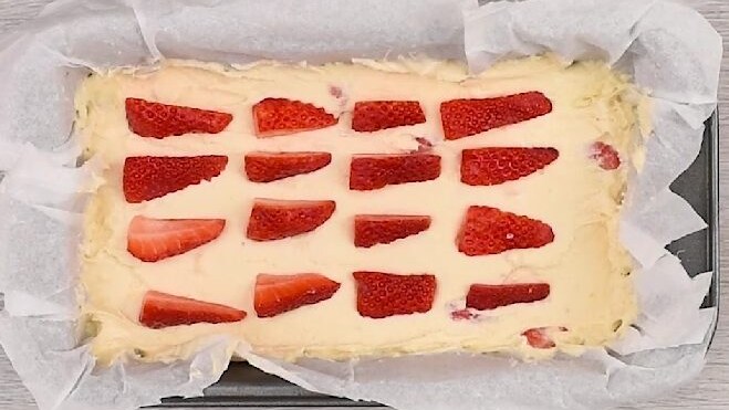 Aggiungi le fragole a pezzi 7 e incorporale bene 8. Distribuisci per bene il composto nello stampo rettangolare rivestito con carta forno 9.