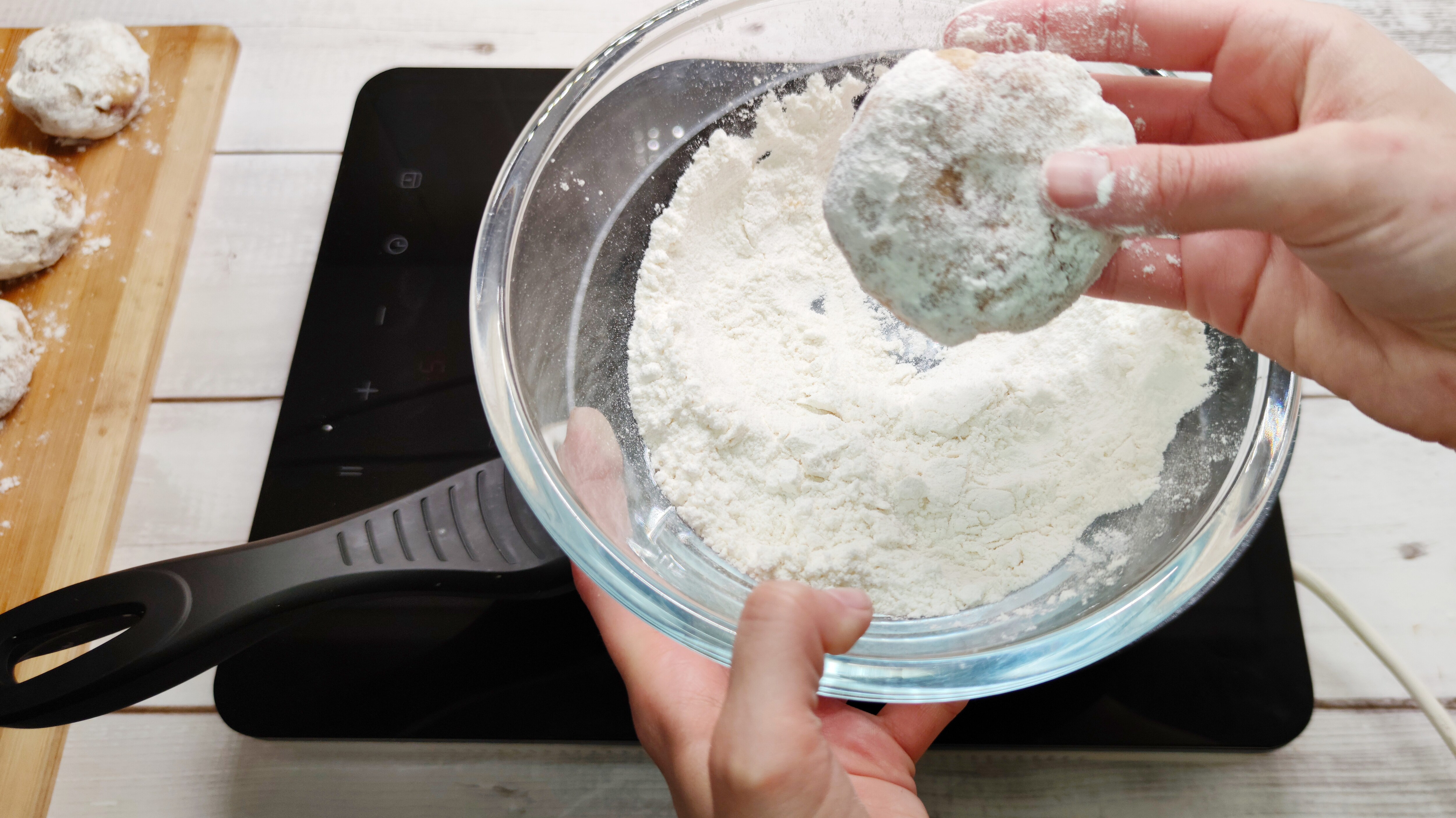 Il passaggio nella farina è fondamentale per creare uno strato compatto e uniforme; qualora preferiste una panatura più classica, potete procedere con farina, uovo sbattuto e pangrattato.