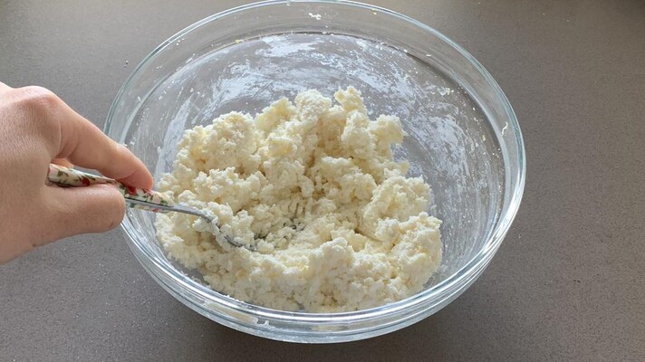 Raccogli la ricotta ben scolata dal siero in una ciotola e riducila in crema con i rebbi di una forchetta 1.