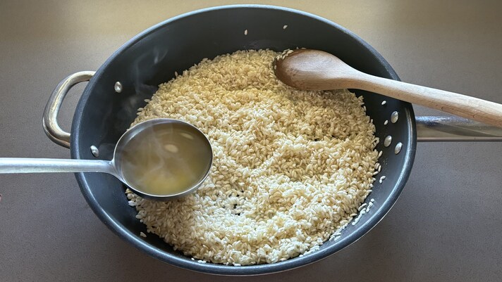 Quando i chicchi saranno caldi e traslucidi, versa un mestolino di brodo vegetale bollente 2.