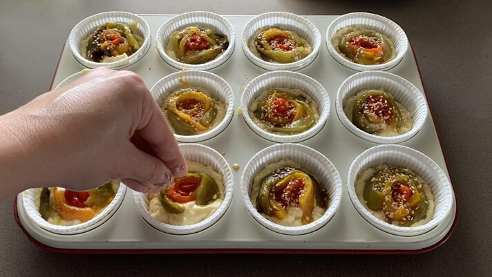 Si preparano con un impasto senza burro a base di farina, lievito in polvere, parmigiano grattugiato, olio di semi, latte e uova, arricchito poi con cubetti di provola e insaporito quindi con un pizzico di sale e una macinata di pepe. Una volta ottenuto un composto cremoso e omogeneo, ti basterà versarlo in un apposito stampo per muffin, rivestito con pirottini di carta, guarnire la superficie con i peperoni arrostiti di diversi colori, tagliati a listerelle e disposti al centro di ogni tortino in modo da ricreare tante piccole roselline, e cospargere infine con una spolverizzata di semi di sesamo.