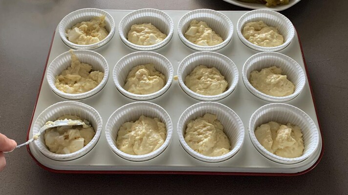 Distribuisci l'impasto all'interno di uno stampo per muffin, rivestito con pirottini di carta, senza arrivare fino al bordo 9.