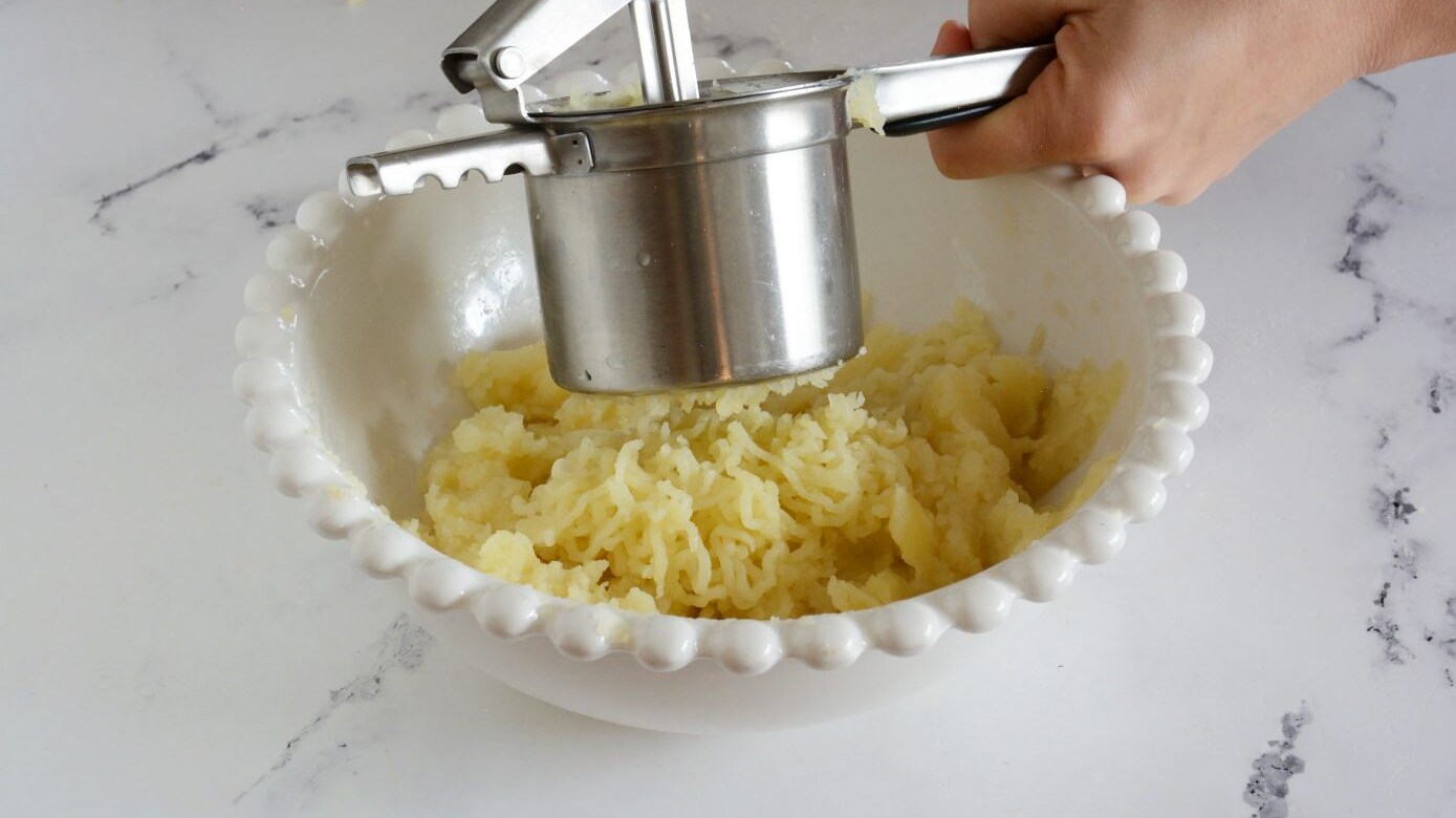 Lessa le patate con la buccia in acqua bollente, finché non saranno ben morbide. Scolale, sbucciale quindi schiacciale con uno schiacciapatate raccogliendo la purea in una ciotola 1.
