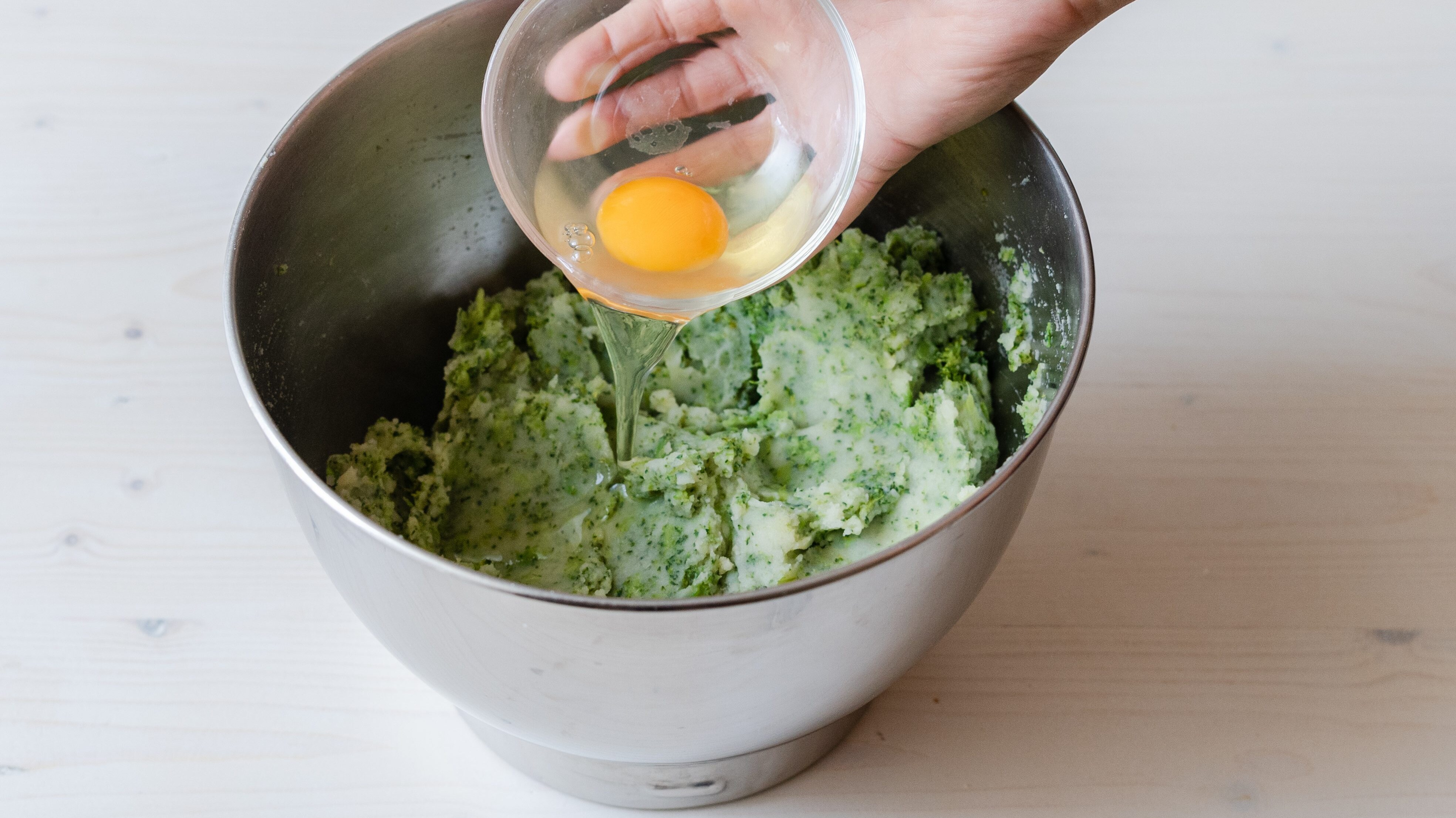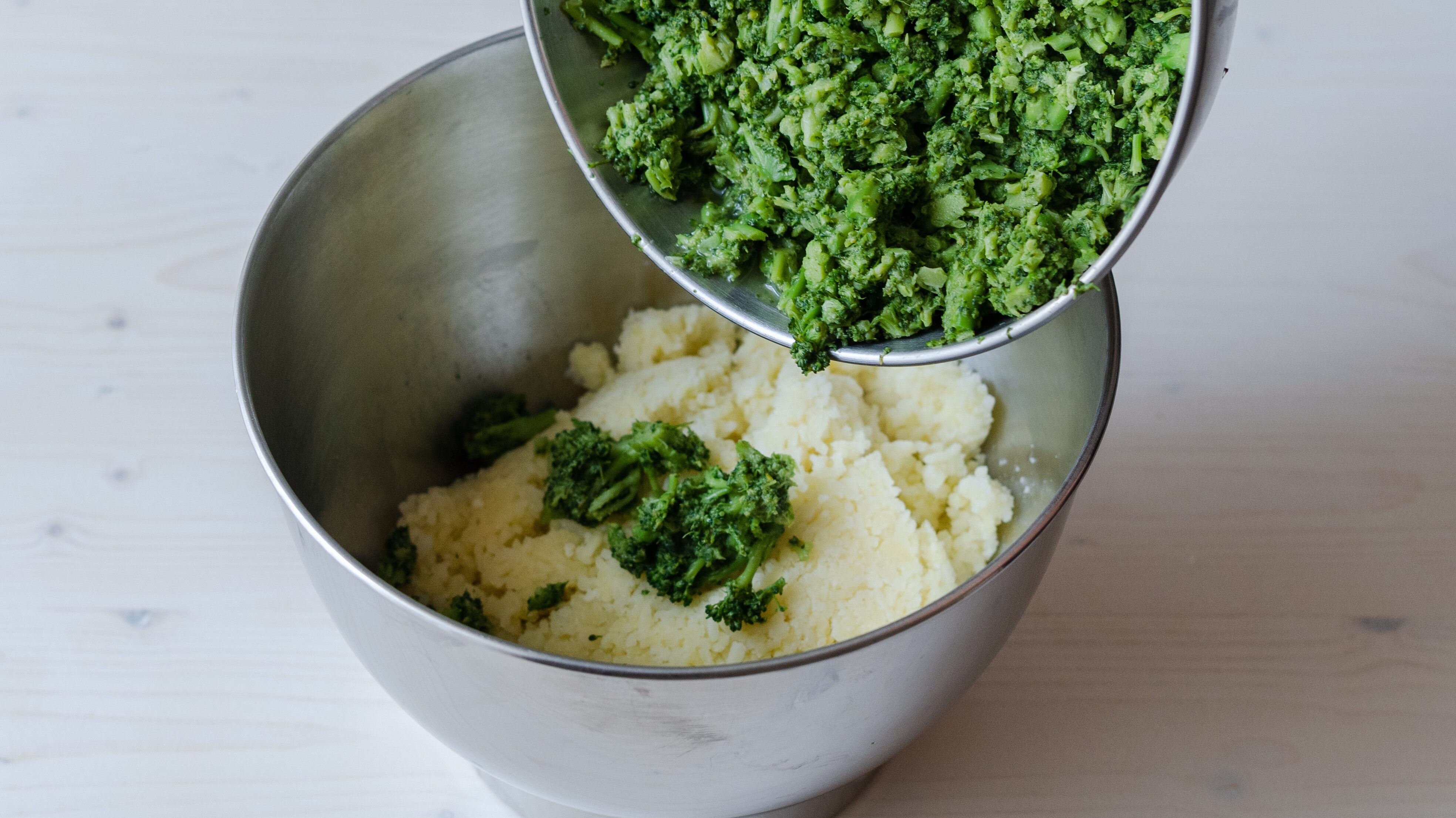 Trasferisci la purea di patate in una ciotola capiente e unisci i broccoli, leggermente schiacciati con una forchetta 5.
