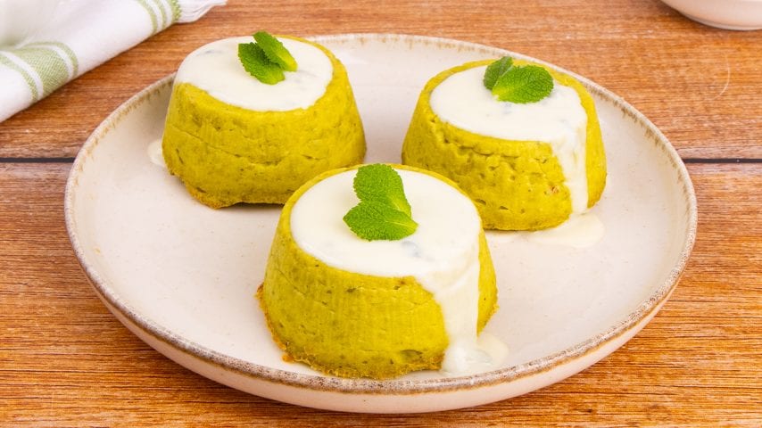 Vela gli sformatini con la fonduta di gorgonzola 14 e guarnisci con qualche fogliolina di menta.