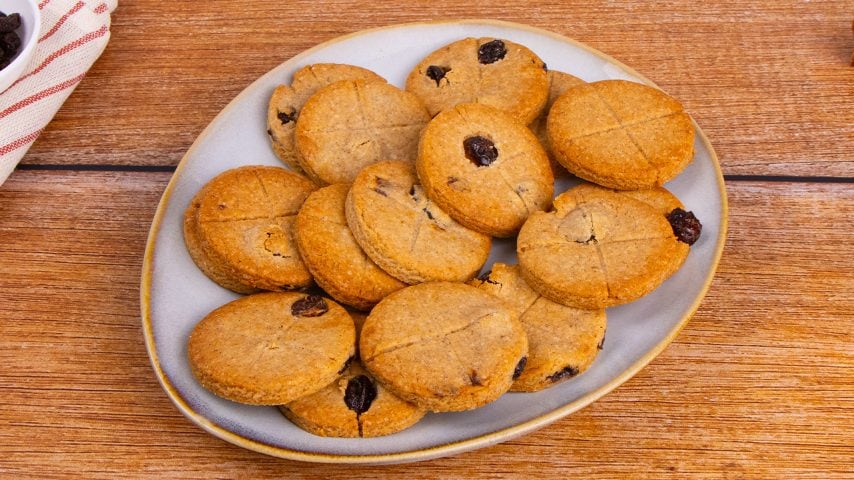 Disponi i biscotti su una teglia rivestita con carta forno e, con un coltello, incidi una piccola croce sulla superficie di ciascuno 9.
