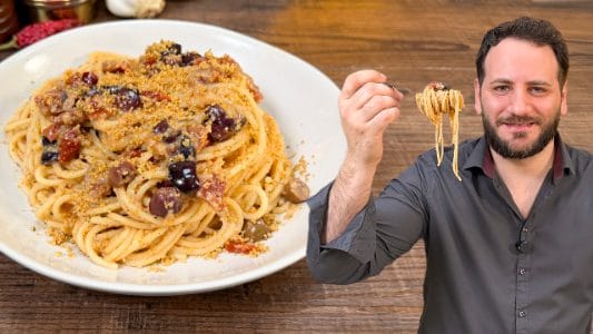 Gli spaghetti di magro sono un primo piatto povero, ma molto saporito, realizzato con un condimento fragrante a base di pomodorini secchi, olive nere, peperoncino, rosmarino e aglio, arricchito con pangrattato frullato con gherigli di noce ed erbe aromatiche.