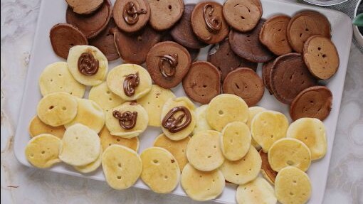 Prepara delle piccole frittelle nella padella calda utilizzando la sac à poche 4. Gira le mini frittelle quando si formeranno delle bolle sulla superficie e cuoci per un altro minuto. Decora qualche mini pancake con la crema di nocciole 5 e forma gli spiedini, alterna i pancakes chiari con quelli al cacao. Servi le frittelle con la crema di nocciole. Gli spiedini di pancakes sono pronti per essere gustati 6.