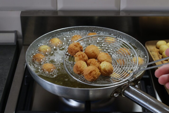 - Scegli una padella dal bordo alto: in questo modo potrai mettere molto olio e le castagnole potranno galleggiare e quindi cuocere in maniera uniforme: ti basterà farle roteare un po' per avere una cottura omogenea.