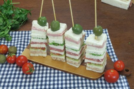 Per prepararle, occorrerà del pane bianco in cassetta senza crosta da farcire con i tuoi ingredienti preferiti. Nella nostra versione, abbiamo realizzato strati di salsa tonnata, pesto di basilico e pomodori, salame, insalata, formaggio cremoso e mortadella, ma puoi utilizzare tutto ciò che hai a disposizione in casa: maionese e altre salsine homemade, mousse salate, hummus di legumi, ricotta, affettati vegani o verdure grigliate al posto dei salumi per una variante vegetariana e così via.