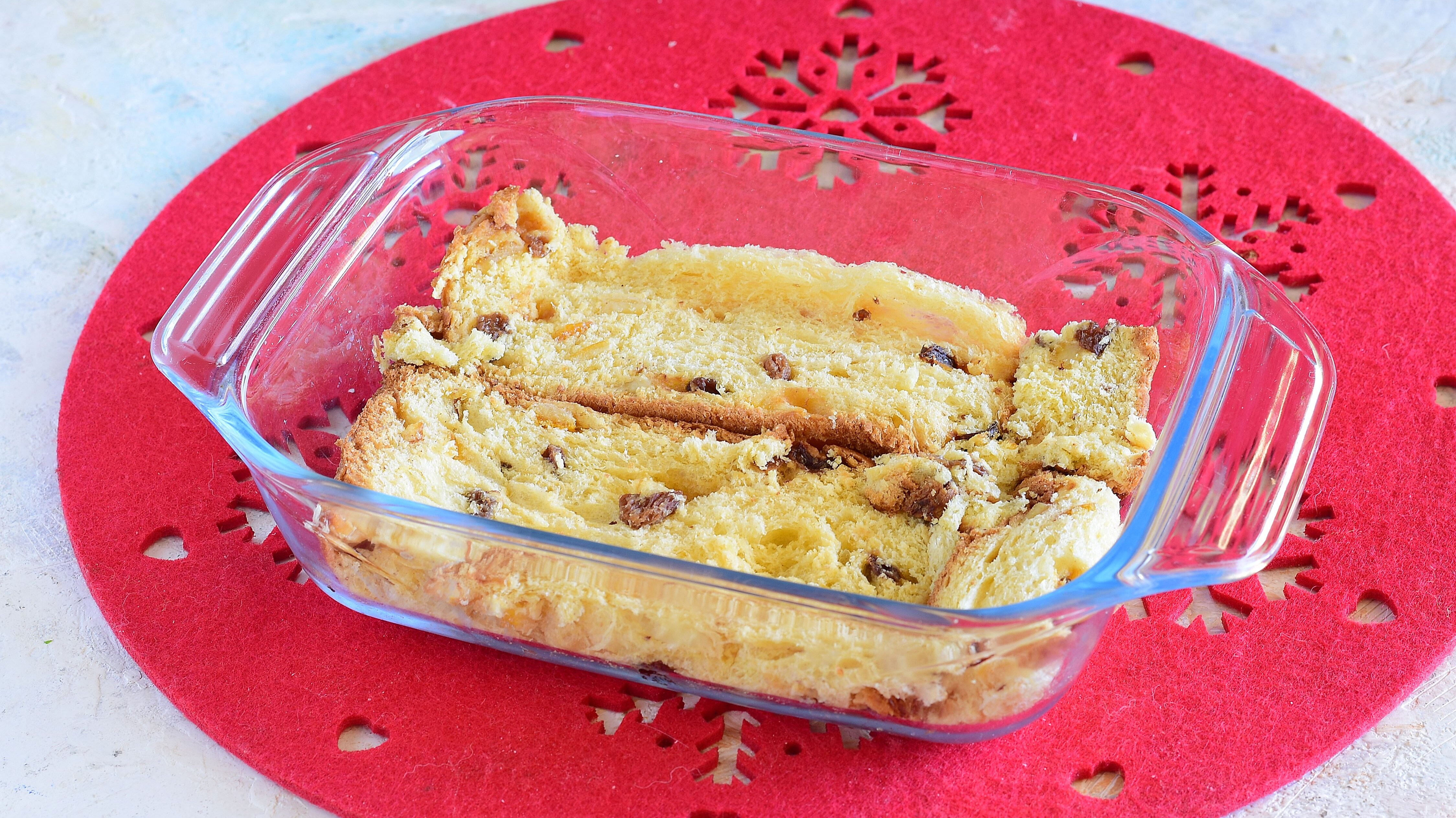 Taglia il panettone a fette di circa 1 cm di spessore e sistemale sul fondo di una pirofila rettangolare da 30 x 20 cm 1.