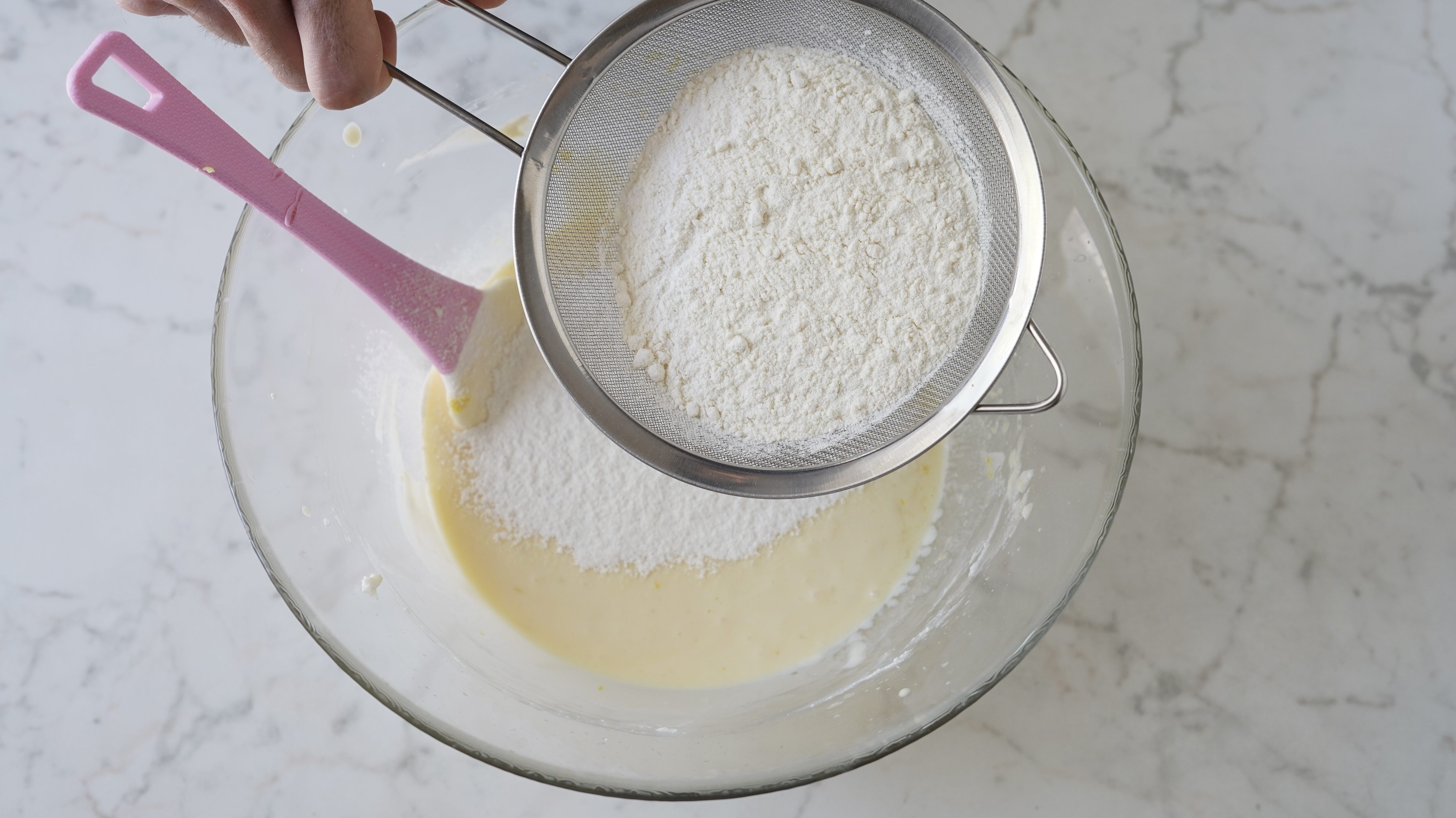 In ultimo unisci la farina, setacciata con il lievito 4, e amalgama ancora fino a ottenere un composto liscio e omogeneo.