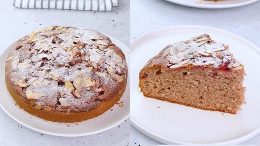 Cospargi di mandorle a lamelle 6 e cuoci in forno statico già caldo a 180 °C per 45 minuti. Prima di sfornare, verifica la cottura interna con la prova stecchino e, quando la torta sarà pronta, sfornala e lasciala raffreddare completamente. Infine, trasferiscila su un piatto da portata e spolverizzala di zucchero a velo.