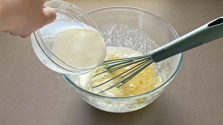 Versa a filo il latte 2 e l'olio di semi, proseguendo a mescolare.