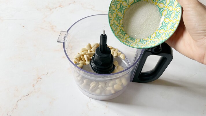 Sistema le mandorle nel mixer con 40 grammi di zucchero, presi dalla dose totale 1, quindi frulla per 1 minuto.