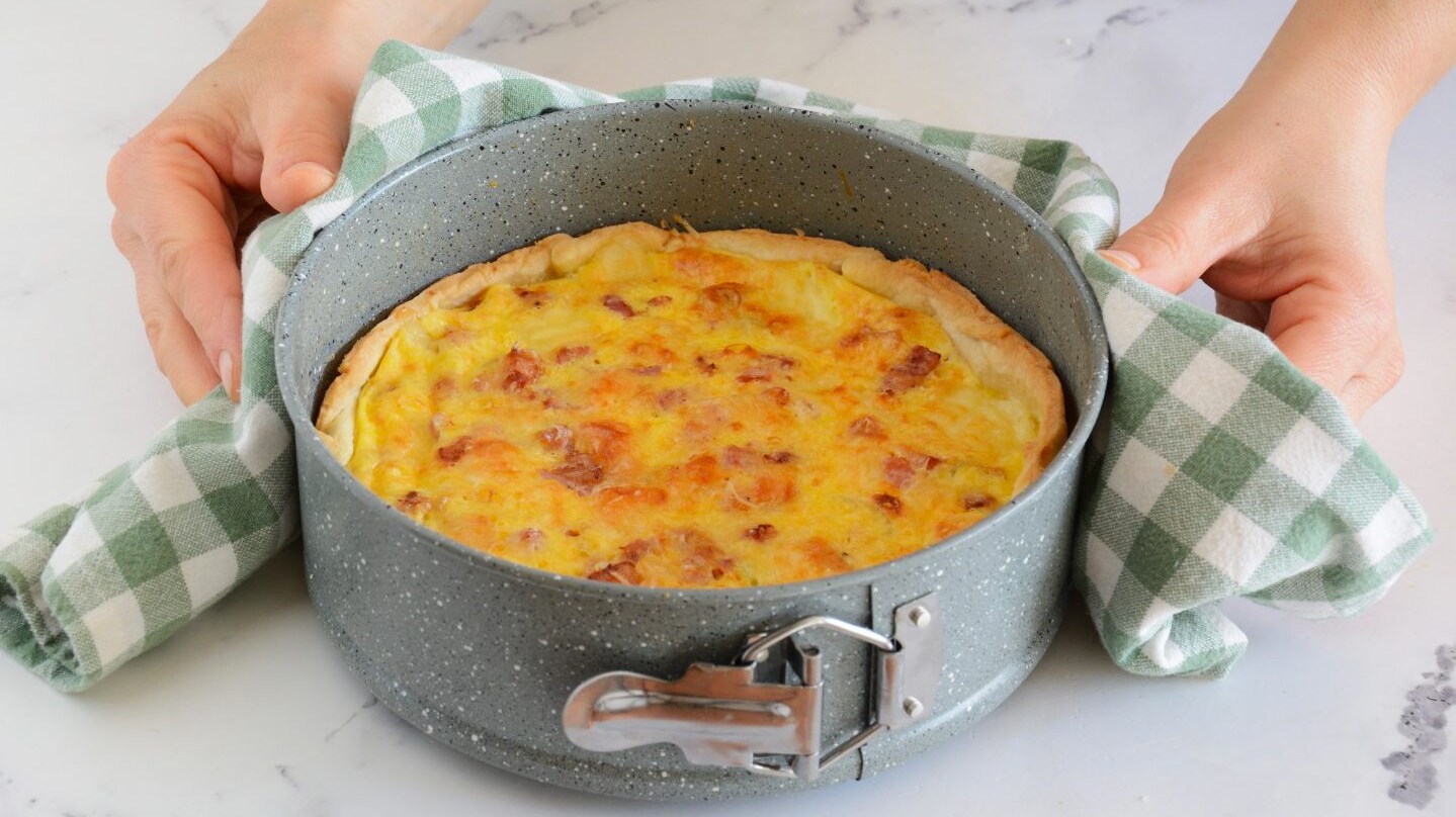 Per prepararla, ti basterà rivestire con la pasta brisée una teglia a cerniera da 22 cm di diametro, distribuire sul fondo un ripieno goloso e saporito a base di porri stufati, pancetta croccante e formaggio brie a cubetti, e ricoprire infine il tutto con un composto di uova sbattute, panna liquida e parmigiano grattugiato. Il passaggio in forno caldo a 195 °C per circa mezz'ora farà il resto, regalando una quiche fragrante e cremosa al morso, ottima da portare in tavola anche all'ora dell‘aperitivo o in occasione di un buffet di festa.