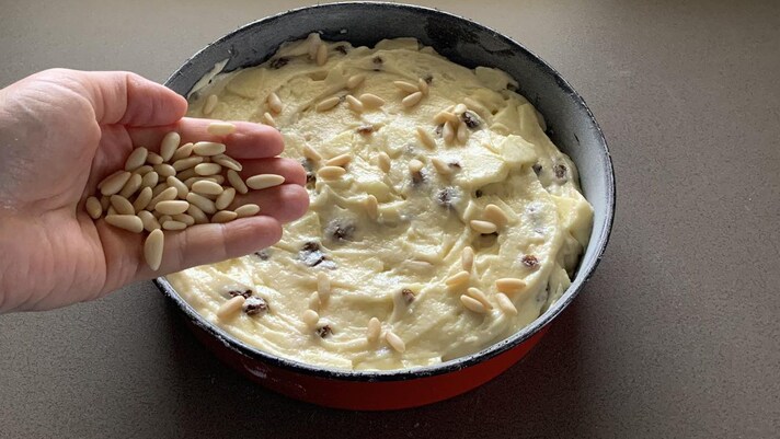 Distribuisci l'impasto in una teglia da 22 cm di diametro, ben imburrata e infarinata, e cospargi la superficie con i pinoli rimanenti 7.