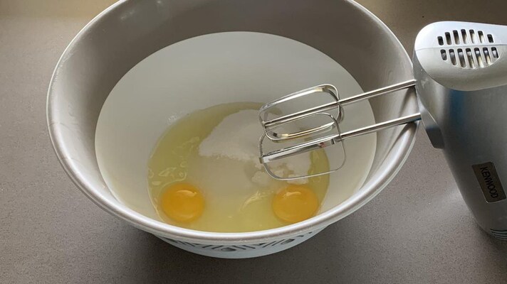 Raccogli in una terrina capiente le uova con lo zucchero semolato 1 e montale con le fruste elettriche fino a ottenere un composto chiaro e spumoso.