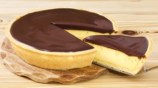 In questa ricetta, che unisce 3 preparazioni differenti, un guscio di fragrante pasta frolla accoglie al suo interno una morbida crema a base di ricotta, tuorli, vaniglia e fecola di patate; il tutto ricoperto in superficie da una ganache al cioccolato fondente lucida e croccante. Il risultato sarà una torta golosissima, ideale da servire a fine pasto o in occasione di un buffet di festa.