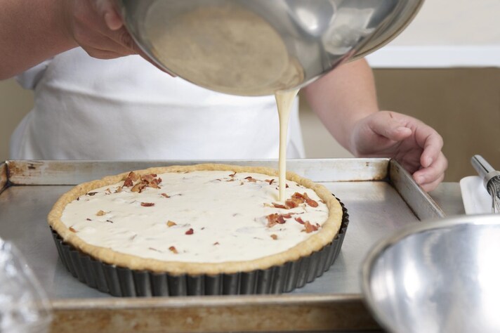Il ripieno è il dettaglio fondamentale: quello della quiche ha un nome preciso, e si chiama appareil o appareil à quiche. Si realizza mescolando in una ciotola uova e panna acida (se non si trova si sostituisce con la panna fresca), unendo sale e noce moscata, amalgamando bene il tutto con una frusta, in quanto non devono esserci grumi. Un composto neutro in cui può comparire anche del latte oppure, al posto della crème fraîche, la crème fleurette, una sua versione più liquida e meno densa. A questo punto, si passa ad aggiungere i più svariati elementi per dare gusto: nella quiche lorraine originale si unisce solo la pancetta, anche se ormai è comune mettere insieme del groviera (come sdoganò il celebre chef Escoffier) o dell’emmental, riproponendo quella che oltralpe è conosciuta come quiche vosgienne. Via libera poi agli ingredienti che più piacciono: molto popolari in Francia troviamo le zucchine, i funghi e i porri. Per quanto riguarda le torte salate non c’è una regola generale: il ripieno cambia a seconda che si tratti di una specialità legata al territorio (tipo l’erbazzone), al periodo dell’anno (dove si usano ingredienti di stagione o legati a una ricorrenza) o, più banalmente, rispetto a ciò che si ha in frigorifero, visto che si tratta di un piatto perfetto in chiave anti spreco.