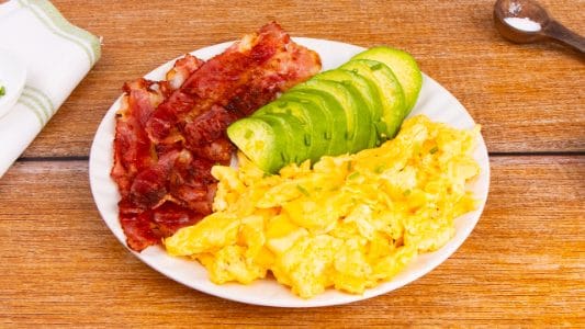 Uova e bacon sono un secondo facile e saporito, velocissimo da preparare con pochi ingredienti: uova strapazzate, fettine di pancetta tesa croccanti e, ad arricchire, un avocado giunto al giusto grado di maturazione, tagliato a fettine e guarnito con erba cipollina tritata.