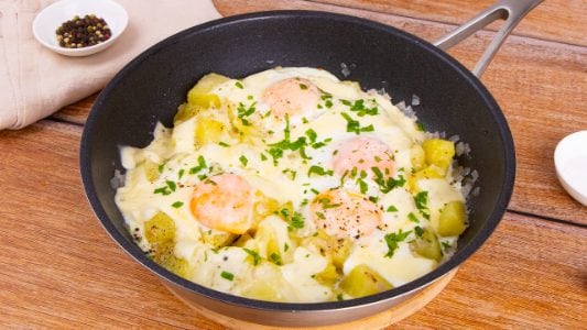 Cotte dolcemente con un coperchio fino a quando l'albume non sarà diventato bianco e il tuorlo ricoperto da una patina lucida e brillante, uova e patate in padella conquisteranno grandi e piccini per la consistenza cremosa e filante al morso.