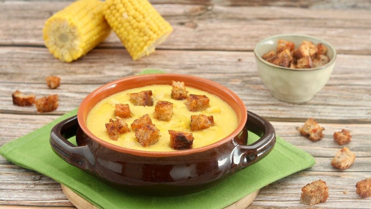 La vellutata di mais e porri è una valida alternativa alle classiche minestre di cereali e ci consente di sfruttarne la versatilità per assaporarlo in una veste tutta nuova. Per renderla ancora più stuzzicante, abbiamo deciso di completare la vellutata con crostini di pane casereccio, aromatizzati alla paprica dolce, ma se volete conferire una nota più decisa potete optare per la paprica piccante o affumicata (o anche altre spezie, come il curry o la curcuma). Potete aggiungere anche delle erbette aromatiche, come rosmarino e timo.