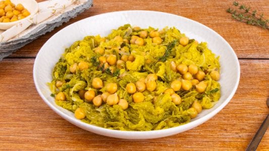Verza e ceci in padella è un secondo rustico, sano e leggero, perfetto per la stagione invernale. Si prepara con le foglie di verza tagliate a striscioline, fatte insaporire in un soffritto di olio e cipolla, stufate con il brodo vegetale e arricchite, infine, con ceci precotti e un rametto di timo sfogliato.