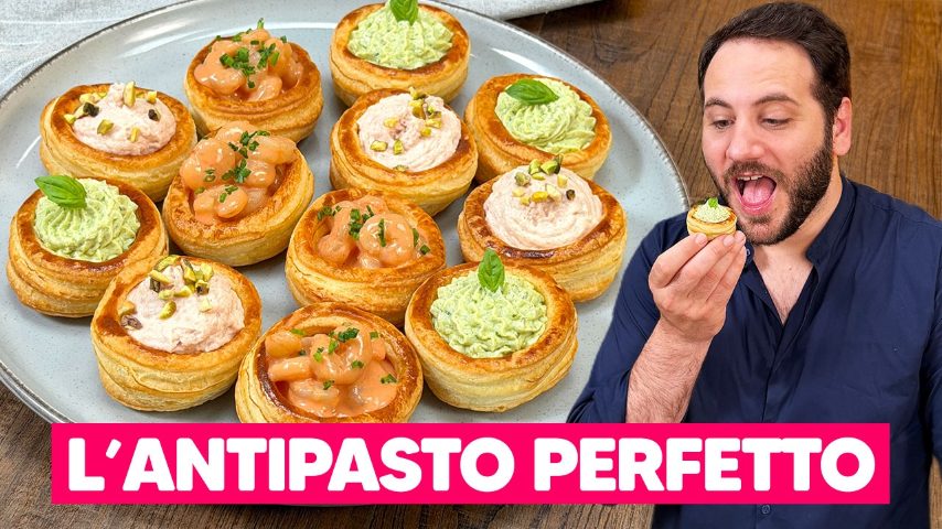 In questa ricetta il nostro Elpidio ti mostrerà come realizzarli con pasta sfoglia pronta, ottenendo così in poco tempo dei fragranti cestini di sfoglia: considera che per ogni vol-au-vent ti occorreranno 3 dischetti – uno intero e due anelli – che otterrai con l'aiuto dei coppapasta. Per la farcia abbiamo preparato 3 diversi ripieni, semplici e scenografici: gamberetti in salsa cocktail, mousse di mortadella e crema al formaggio aromatizzata al pesto di basilico. La prima farcia sarà realizzata con gamberetti scottati in padella e poi mescolati con un mix di ketchup, maionese e decorati con erba cipollina; la seconda sarà invece preparata con mortadella, ricotta, panna fresca e parmigiano, decorati con granella di pistacchi; il terzo ripieno sarà ottenuto, invece, mescolando insieme formaggio cremoso e pesto di basilico. Una volta pronti, portali in tavola per completare il tuo menu della Vigilia, di Natale o di Capodanno oppure servili per un'occasione speciale.